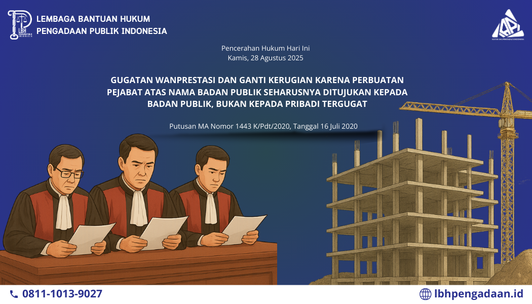 GUGATAN WANPRESTASI DAN GANTI KERUGIAN KARENA PERBUATAN PEJABAT ATAS NAMA BADAN PUBLIK SEHARUSNYA DITUJUKAN KEPADA BADAN PUBLIK, BUKAN KEPADA PRIBADI TERGUGAT