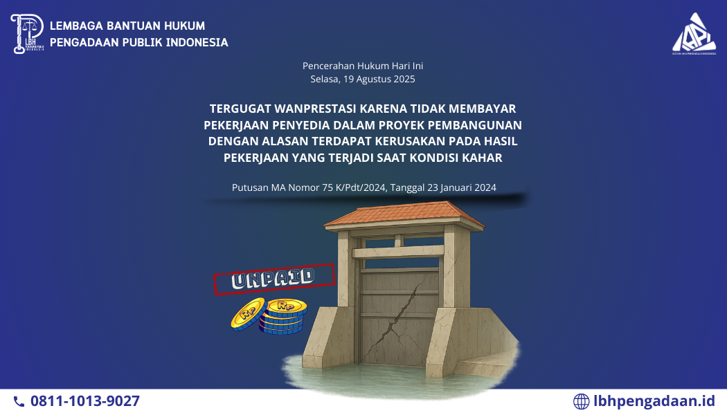 TERGUGAT WANPRESTASI KARENA TIDAK MEMBAYAR PEKERJAAN PENYEDIA DALAM PROYEK PEMBANGUNAN DENGAN ALASAN TERDAPAT KERUSAKAN PADA HASIL PEKERJAAN YANG TERJADI SAAT KONDISI KAHAR
